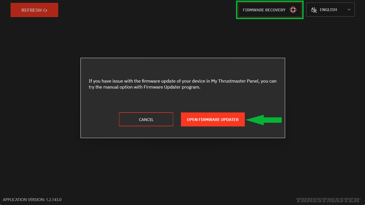 * If the firmware version displayed in Device is identical to the one shown in Firmware, your SF1000 is already up to date. You may then close both the Firmware Update application and My Thrustmaster Panel.