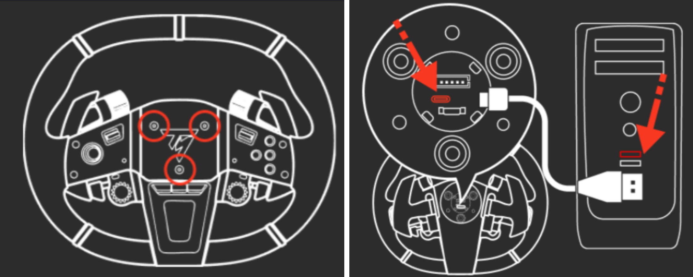 Connect your T818 or T598 racing wheel base with your wheel add-on to a USB port on your PC. Ensure the switch located at the back of the base is set to ON.