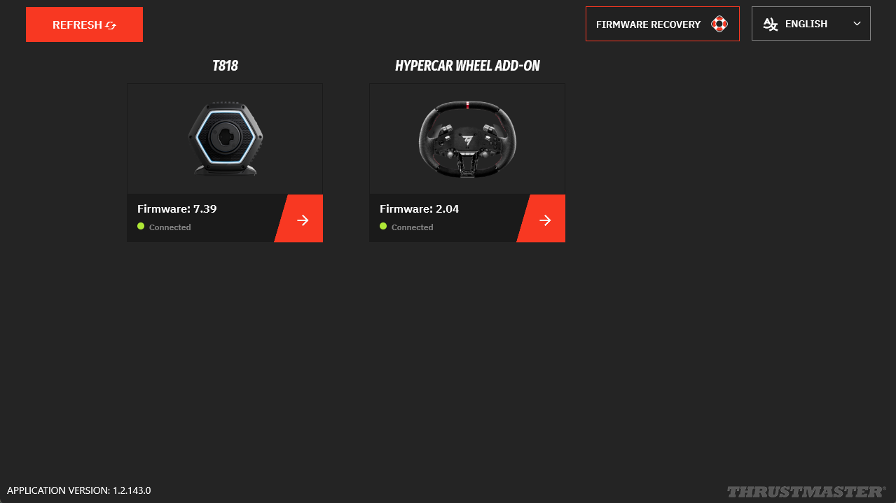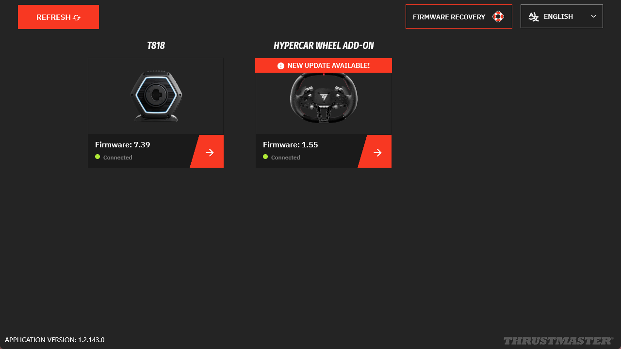 This article is exclusively intended for updating next-generation Thrustmaster wheel add-ons used with a T818 or T598 base. It explains the procedure to follow via the My Thrustmaster Panel application, illustrated using the Hypercar Wheel Add-On mounted on a T818 base.