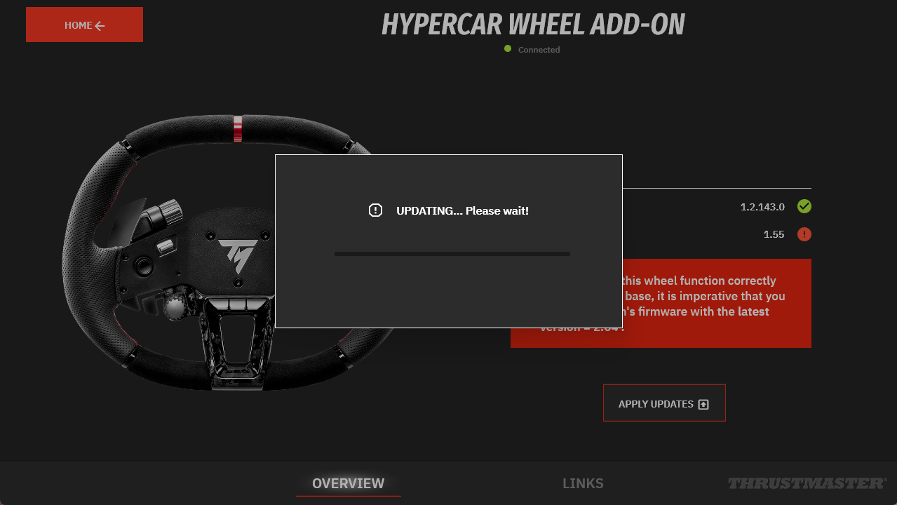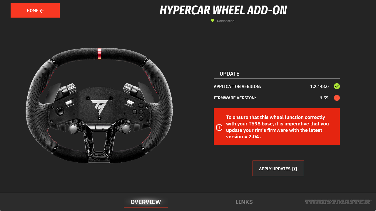 My Thrustmaster Panel must be connected to the internet so it can retrieve the latest updates. At the bottom of the tabs, a green indicator displays “Connected.”