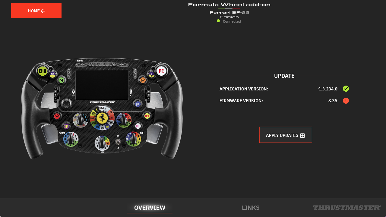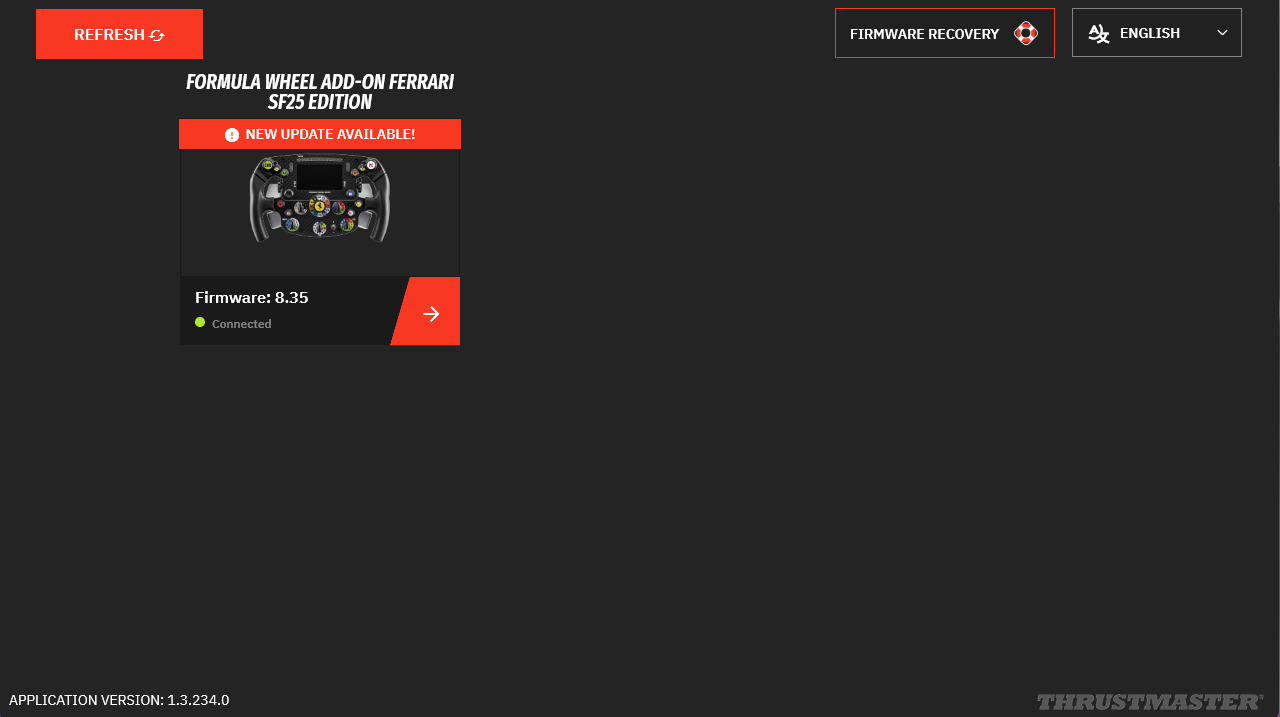 - If an update is available, a red message “NEW UPDATE AVAILABLE”* will appear on the icon of your Formula Wheel Add-On Ferrari SF-25 Edition.