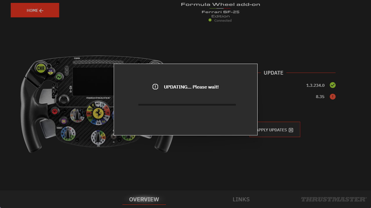 My Thrustmaster Panel must be connected to the internet to retrieve the latest updates. At the bottom of the tab, a green indicator shows “Connected”.