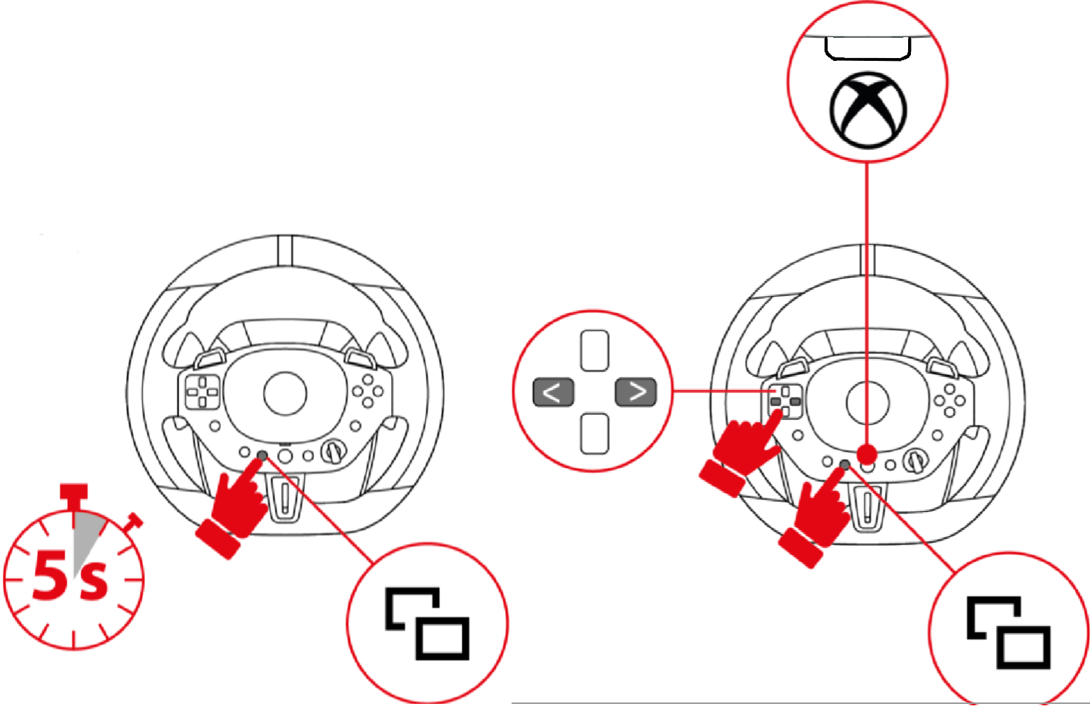 Connect your T98 Ferrari 296 GTS (Xbox One/XBox Series/PC) to a USB port on your Xbox console via the USB-C / USB-A cable, wait and then press the Xbox button located on the steering wheel so that the console detects the steering wheel.