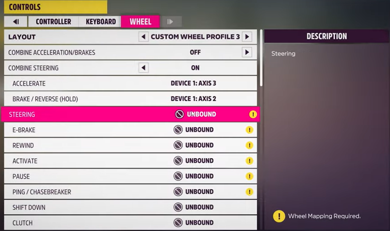 - As a confirmation, UNBOUND will be replaced by the name of the axis or button (DEVICE 1: AXIS, etc.).