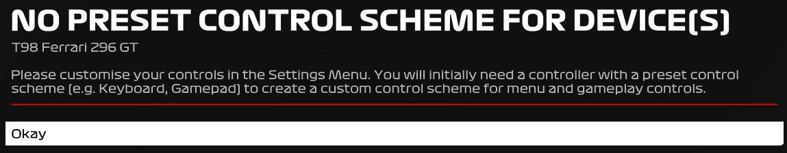 When using your T98 in F1® 23 or F1® 24 for the first time, once past the home page, you get a message that T98 is detected but needs to be mapped.
