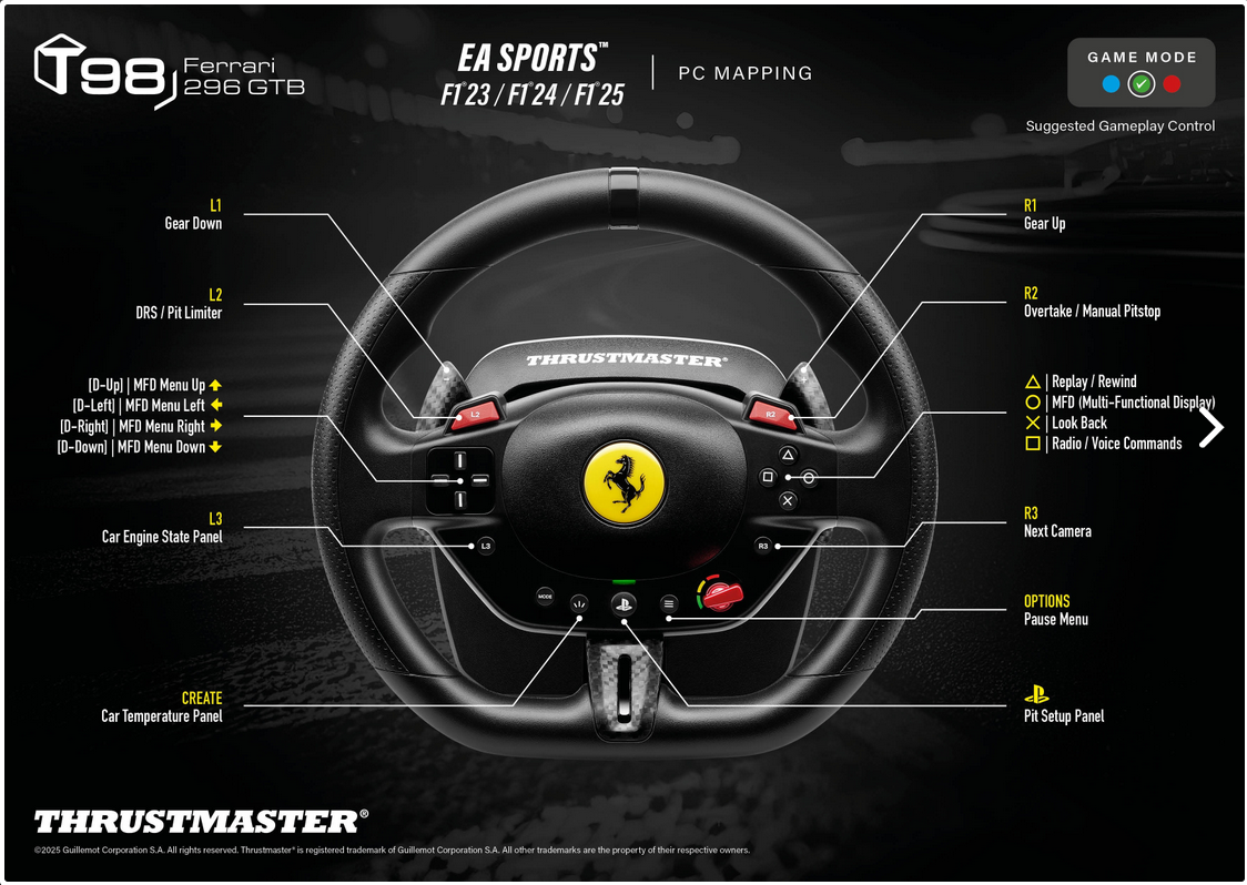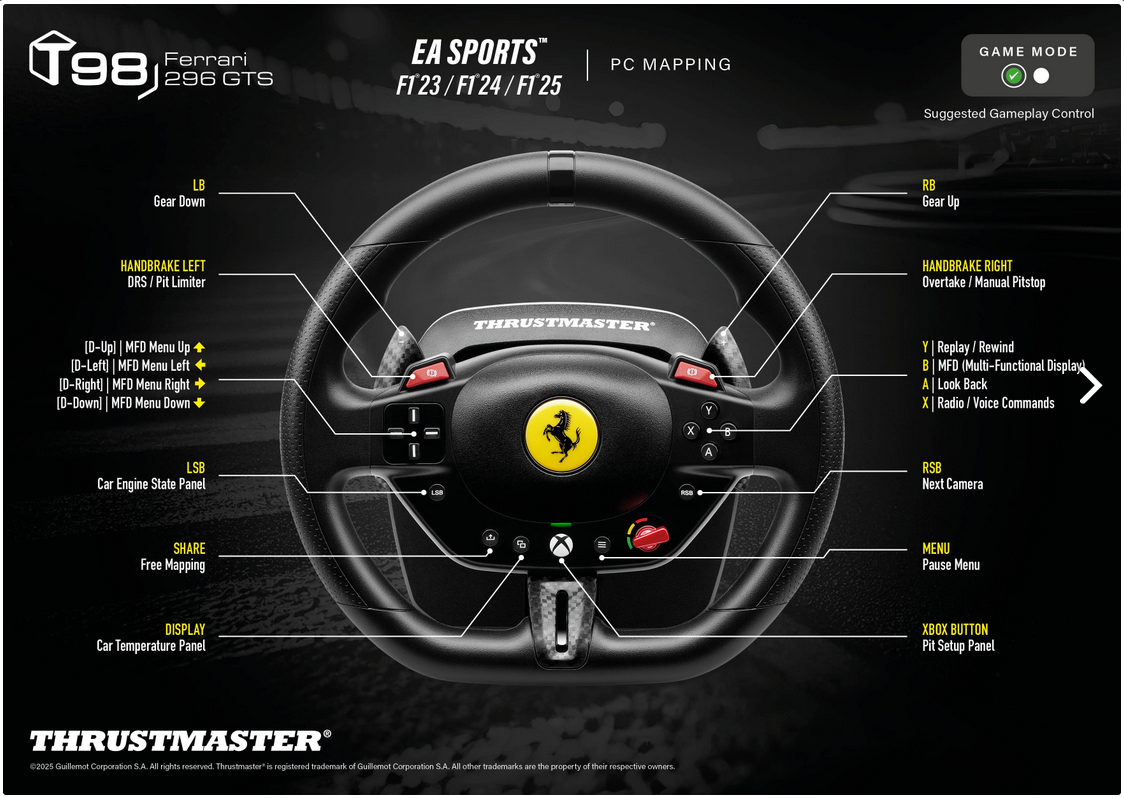 For F1® 25: the T98 is natively compatible with the F1® 25 (PC version) game. The T98's buttons and axes are active for gameplay, and you will find the steering wheel in the game's controllers under the name T80.