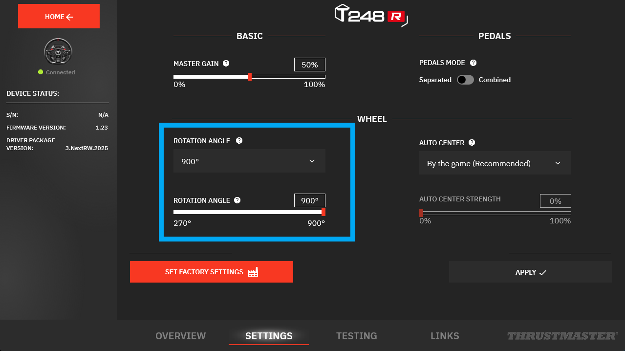 要在 My Thrustmaster Panel(PC)中设置转向角度,请进入 SETTINGS,然后在 ROTATION ANGLE 中选择 900° 的转向角度。